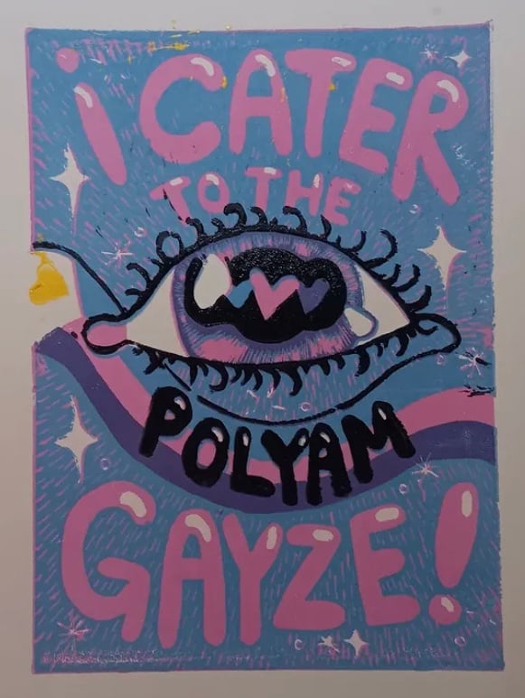 For my polyamorous fans. This reduction linocut print continues the Queer Gayze series.☺️ Because I was just reading Boyfriends Vol.1 by Refrainbow, I was inspired by the lush pastel colors and wanted to give this print a similar feel.